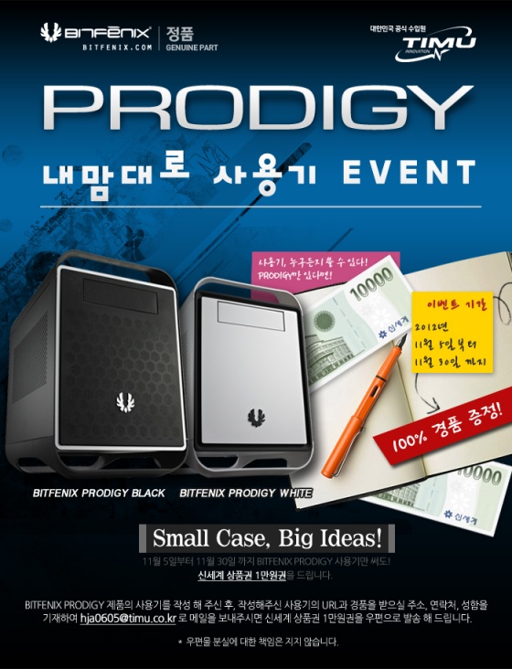 (주)이노베이션티뮤(http://www.timu.co.kr 대표: 이광재)는 비트피닉스(BITFENIX)의 PC케이스 제품인 '프로디지(Prodigy)' 제품의 자율 사용기 이벤트를 실시한다고 밝혔다.