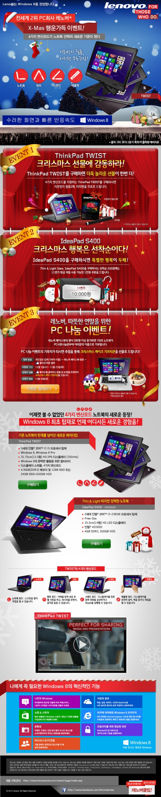 한국레노버는 크리스마스를 맞이해 씽크패드 트위스트를 구매하는 고객에게 지문방지 필름 2매와 스타일러스 터치펜을 무료로 제공하고, 아이디어패드 S400을 구매하는 고객에게는 11번가에서 할인 쿠폰을 증정한다.