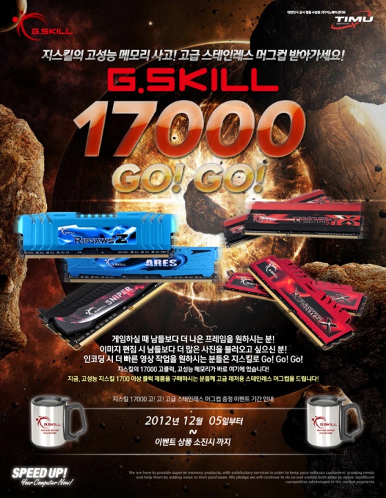 이번 이벤트는 지스킬의 PC-17000(2133Mhz)이상 클럭을 지원하는 PC 메모리 제품을 구매하는 유저들을 대상으로 이벤트 메모리 구매 시 레저용 고급 스테인레스 머그컵을 증정하는 방식으로 진행된다