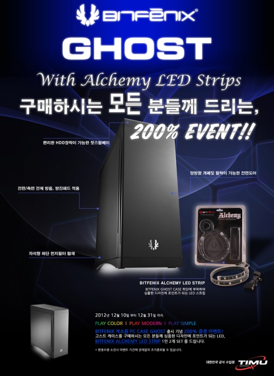(주)이노베이션티뮤 (http://www.timu.co.kr 대표: 이광재)는 비트피닉스(BITFENIX)의 신규 PC 케이스 제품 고스트(GHOST)출시를 기념하는 이벤트를 진행한다고 금일(13일) 밝혔다.