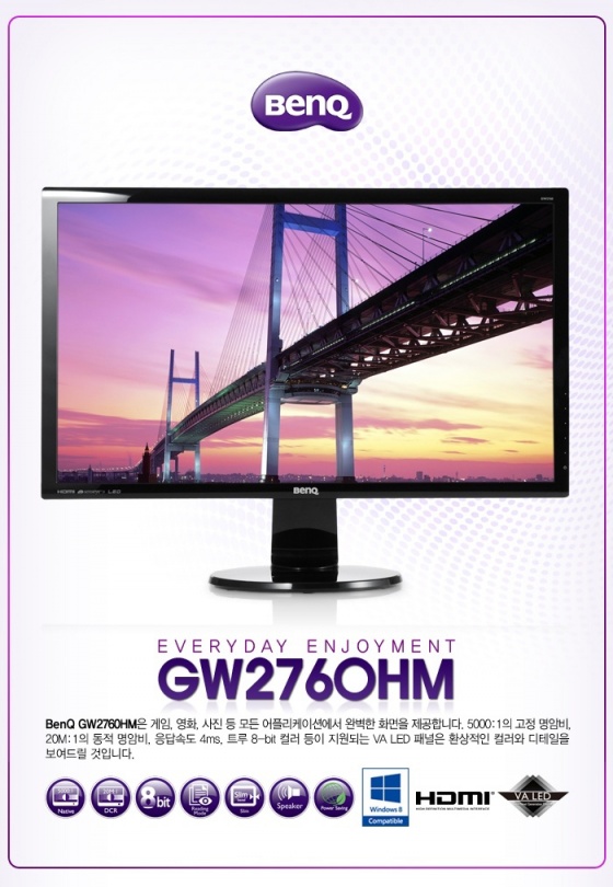 출시된 GW2760HM 제품은 기존 GW2750HM 제품의 정식 후속 모델로서 IPS 패널을 사용한 제품보다 더 선명하고 깊이 있는 색감을 표현하는 것으로 잘 알려진 VA 패널을 채용하고 LED 백라이트 방식을 적용하여 발열, 전력 소모량을 줄였으며, IPS 패널과 마찬가지로 광시야각을 지원하여 상하좌우 178도 내외에서는 색감 변화 없이 사용이 가능하다.