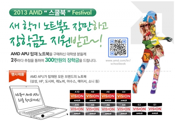 AMD가 2013년도 새학기를 맞아 대학생들의 마음을 잡기위한 온오프라인 '2013 AMD 스쿨북 페스티발'을 펼친다고 금일(3일) 밝혔다.
