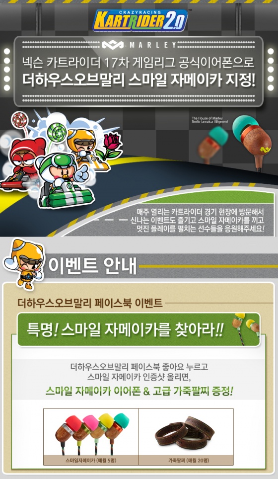 '스마일 자메이카' 이어폰은 컬러풀한 색상과 동글동글 귀여운 디자인이 '카트라이더'의 메인 캐릭터들과 완벽한 싱크로율을 자랑하며 게임의 즐거움을 배로 느끼게 해준다. 8mm의 진동 코일 드라이버가 전해주는 깨끗하고 선명한 사운드로 한층 실감나는 게임을 즐길 수 있다. 특히 FSC 인증을 받은 사펠리(Sapele)와 너도밤나무, 재활용이 가능한 고무팁 등으로 만들어진 독특한 외관은 남녀구분 없이 누구에게나 사랑 받는 이유이다.