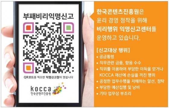 한국콘텐츠진흥원(KOCCA 원장 홍상표)이 지난 1일 '윤리경영 선포식'을 가진데 이어 각종 부정부패와 비윤리적 행위 근절을 위한 강력한 익명제보 시스템 을 도입, 금일(15일)부터 운영에 들어간다고 밝히며 '윤리경영 실천'을 위한 제도적 장치를 마련했다고 전했다.