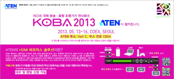 에이텐코리아(대표 첸순청, www.aten.co.kr)는 오는 13일부터 16일까지 삼성동 코엑스에서 개최되는 방송/영상기기 전시회 '코바(KOBA0 2013)'에 참가해 자사의 밴크리스트 비디오 솔루션을 대거 선보인다고 금일(2일)밝혔다.