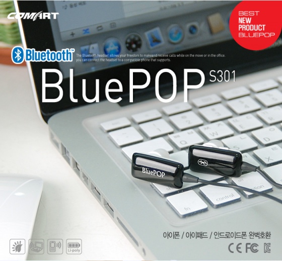 그 외에도 블루팝 S301은 블루투스 v2.1+EDR을 채택해 빠른 전송속도와 간편한 페어링을 지원하며, 한 번 충전하면 최대 4시간연속 통화 및 음악감상이 가능하고 최대 120시간 연속대기가 가능하다. 컬러는 화이트와 블랙, 스카이 블루, 핫 핑크 등 4가지 색상으로 취향에 맞게 선택할 수 있다.