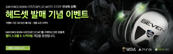 한편, 인트라게임즈는 본 제품의 출시를 기념하여 다음 이벤트(http://j.mp/Zrp2FS)를 준비했다. 먼저 전국의 온/오프라인 판매처에서 EAR FORCE SEVEN 시리즈 제품을 구입한 사람을 대상으로 '엘더 스크롤 V : 스카이림(PC)'을 증정한다.