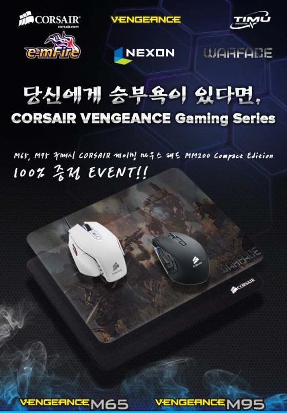 http://www.timu.co.kr 대표 이광재)는 커세어(CORSAIR) 게이밍기어 브랜드 벤젼스(VENGEANCE) 시리즈의 게이밍 마우스 M65, M95 제품 구매자를 대상으로 하는 프로모션 이벤트를 진행한다고 금일(16일) 밝혔다.