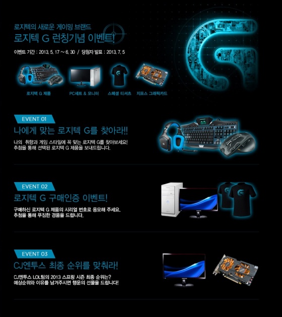이밖에도 ‘CJ엔투스 최종 순위를 맞춰라’ 이벤트는, 행사 기간 내에 자신이 생각하는 CJ엔투스 2013 LOL 챔피언스 스프링 리그 순위, 프로스트와 블레이즈의 예상순위와 그 이유를 로지텍 홈페이지 내 이벤트 페이지에 남기는 이벤트로 참여자 중 추첨을 통해 모니터(1명), 그래픽카드(3명)를 증정한다.