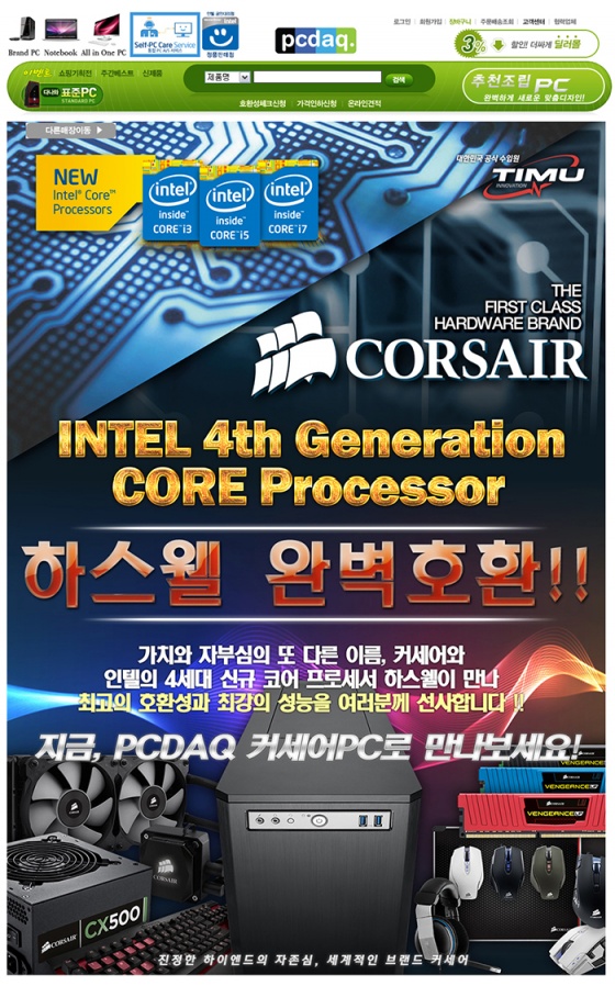 http://www.timu.co.kr 대표: 이광재)가 유통하는 커세어(CORSAIR)의 제품들을 기반으로 한 인텔의 4세대 신규 프로세서인 하스웰 호환 '커세어PC' 판매를 시작했다 금일(20일) 밝혔다.