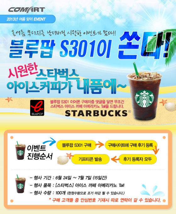 www.comartcnc.com )는 본격적인 여름 시즌을 맞아 '블루팝 S301 블루투스 스테레오 이어셋'을 구매하는 소비자 선착순 100명에 시원한 음료로 교환할 수 있는 기프티콘을 제공하는 이벤트를 실시한다고 금일(24일) 밝혔다.