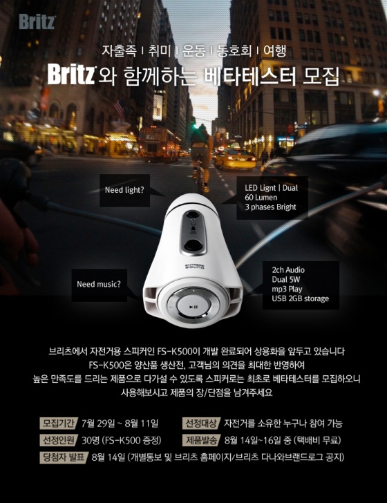 브리츠(www.britz.co.kr)는 이번에 새롭게 개발해 상용화를 앞둔 자전거용 스피커 FS-K500에 대한 정확하고 솔직한 사용자 의견을 받기 위해 금일(29일)부터 사전 테스터를 모집한다고 밝히고 본격적인 모집 절차에 들어갈 예정이다.