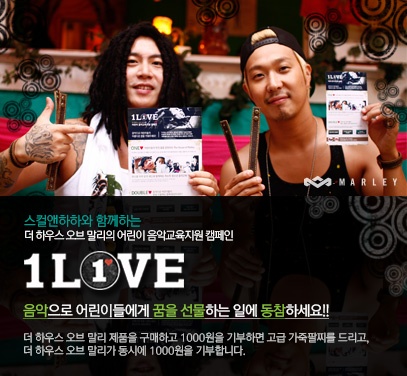‘더 하우스 오브 말리(The House of Marley)’는 음악으로 함께하는 세상을 꿈꿔왔던 밥 말리의 정신을 잇기 위하여 어린이들의 음악 교육을 지원하는 ‘원러브 캠페인’을 진행 중이다. 밥 말리의 후손들에 의해 설립된 ‘원러브(1 Love)’ 재단의 취지에 따라 전제품의 판매 수익금 중 5%를 ‘하나를 위한 음악 재단’에 기부하여 분당에 위치한 한솔 복지관 내 저소득 청소년들이 매주 플루트 악기를 배울 수 있도록 전문 강사료 전액을 지원한다.