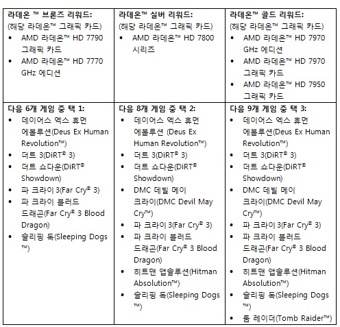 프로모션 참여 판매업체에서 AMD 라데온 HD 7000 시리즈 GPU를 구매한 게이머들은 제품에 따라 라데온 브론즈, 라데온 실버, 그리고 라데온™ 골드 리워드의 세 가지 등급별 쿠폰 중 하나를 받을수 있다. 라데온 브론즈 리워드를 받은 구매자들은 AMD에 최적화된 6개의 게임 중 하나를 선택할 수 있고, 라데온 실버 리워드는 8개의 게임 중 2개를, 최상위 쿠폰인 라데온 골드 리워드는 9개 게임 중에서 3개를 선택할 수 있는 방식이다.