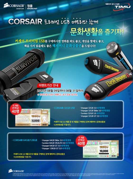 http://www.timu.co.kr 대표: 이광재)는 커세어(CORSAIR)의 USB 제품을 구매하는 유저 대상으로 문화상품권 증정 이벤트를 실시한다고 금일(22일) 밝혔다.