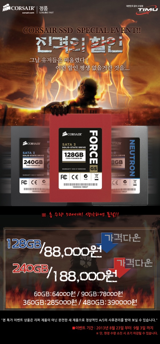 http://www.timu.co.kr 대표: 이광재)는 금일(23일), 커세어(CORSAIR)의 SSD 지정 제품 일부를 수량 한정으로 특별 할인 가격을 적용하여 판매하는 이벤트를 진행한다고 밝혔다.