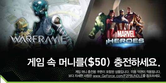 엔비디아(www.nvidia.co.kr, CEO 젠슨황)는 금일(2일)부터 지포스(GeForce) GTX 650 시리즈 그래픽 카드 구매자에게 워프레임(WarFrame)과 마블 히어로즈(Marvel Heroes)에서 사용 가능한 $50(각 게임당 $25씩)의 게임 머니 충전용 쿠폰을 증정하는 엔비디아 F2P번들(Free-to-Play Bundle) 프로모션을 진행한다.