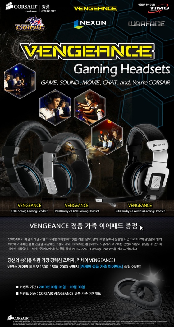 이노베이션티뮤(http://www.timu.co.kr 대표: 이광재)는 커세어(CORSAIR) 게이밍기어 브랜드, 벤젼스(VENGEANCE) 시리즈의 게이밍 헤드셋 제품을 구매하는 소비자들을 대상으로 이벤트를 펼친다고 금일(4일) 밝혔다.