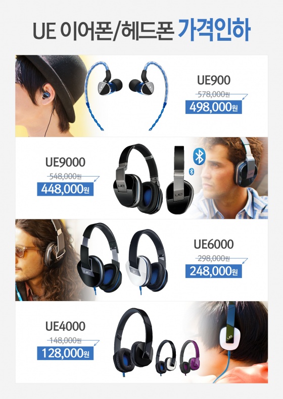 지난 4월 출시된 모바일 음악 감상에 특화된 라인업인 UE이어폰 및 헤드폰 4종의 가격이 13%에서 최대 18%까지 인하된다. 소비자들은 UE900의 경우 기존 578,000원에서 인하된 가격인 498,000원에, 그리고 UE9000의 경우 18% 인하된 가격인 448,000에 구입할 수 있다. 이 밖에도 UE6000의 경우16% 인하된 가격인 248,000원으로, UE4000의 경우 148,000원에서 128, 000원으로 대폭 가격이 인하된다.