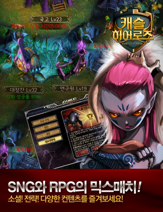 ‘캐슬히어로즈’는 SNG와 RPG가 결합된 장르로 소셜과 전략 두 가지 재미를 모두 갖춘 모바일 게임이다. 100여 가지의 영웅, 1000가지가 넘는 기술 등 방대한 컨텐츠가 준비되어 있어 있으며 스킬 조합, 영웅과 병사 배치 등으로 지루할 틈 없는 턴 방식의 전투를 즐길 수 있다.