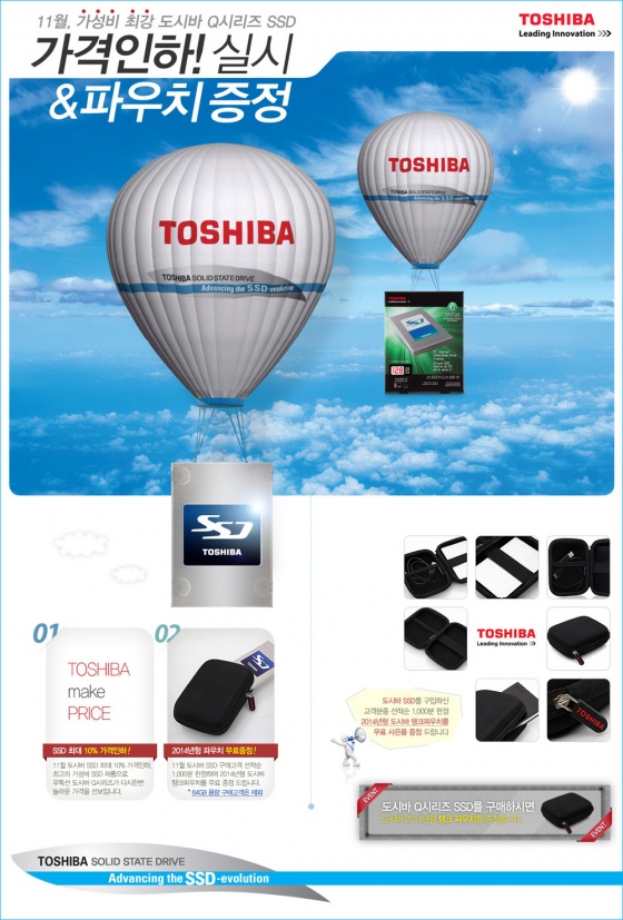 TOSHIBA(이하 도시바)는 인기리에 판매중인 도시바 Q시리즈(H) SSD를 오는 금일(7일)부터 최대 10% 가격인하 적용과 더불어 ‘도시바 파우치’ 증정 행사에 들어간다고 밝혔다.
