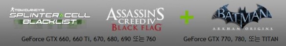 엔비디아(www.nvidia.co.kr, CEO 젠슨황)는 연말을 맞이하여 게이머용 GPU인 '지포스(GeForce) GTX 660'급 이상의 그래픽 카드 구매자들에게 '어쌔신 크리드 IV: 블랙 플래그(Assassin's Creed IV: Black Flag)'와 '톰 클랜시의 스플린터셀 블랙리스트(Tom Clancy's Splinter Cell Blacklist) 디럭스 에디션' 무료 다운로드 쿠폰을 증정하는 홀리데이 번들 패키지를 출시한다고 금일(6일) 밝혔다. 지포스 GTX 770, 780 혹은 TITAN 구매시에는 '배트맨: 아캄 오리진(Batman: Arkham Origins)'을 추가로 즐길 수 있다.
