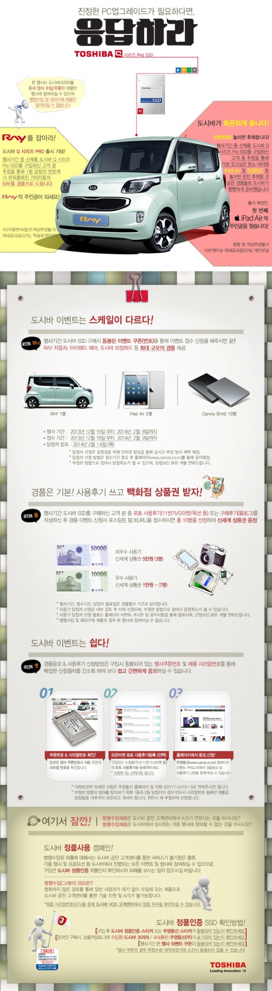 제품을 구매한 고객들은 제품에 동봉된 행사 쿠폰과 SSD의 시리얼번호(일련번호)를 이벤트 페이지(www.canvio.co.kr)를 통해 입력하면 자동 응모되며, 추첨을 통해 레이(RAY) 자동차(1명)와 iPad Air(2명), 외장하드(10명) 등 대규모 경품을 제공한다.