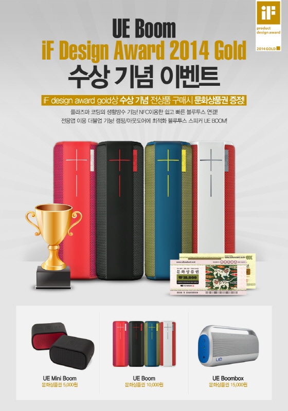 로지텍 코리아는 '얼티밋이어(Ultimate Ears) UE 붐'이 '2014 iF 제품 디자인 어워드'(2014 iF product design award)에서 최고상인 골드 상(Gold Winner)을 수상한 것을 기념해 오픈마켓에서 '얼티밋이어 UE 블루투스 스피커' 구매 고객에게 문화상품권을 증정하는 프로모션을 진행한다.