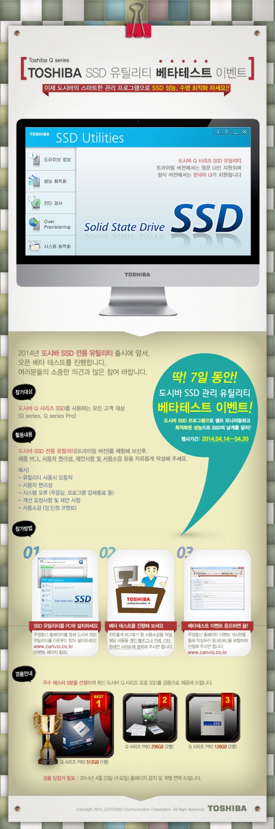 이번 도시바 SSD 유틸리티 베타 테스트 이벤트는 4월 28일까지 해당 프로그램에 대한 버그 및 사용소감등을 자유롭게 작성한 후 온라인 신청할 수 있으며, 우수 베타테스터 추첨을 통해 도시바 최신 SSD인 Q Series Pro 128GB 2명, Q Series Pro 256GB 2명, Q Series Pro 512GB 1명 등 푸짐한 사은품 등을 제공할 예정이다.