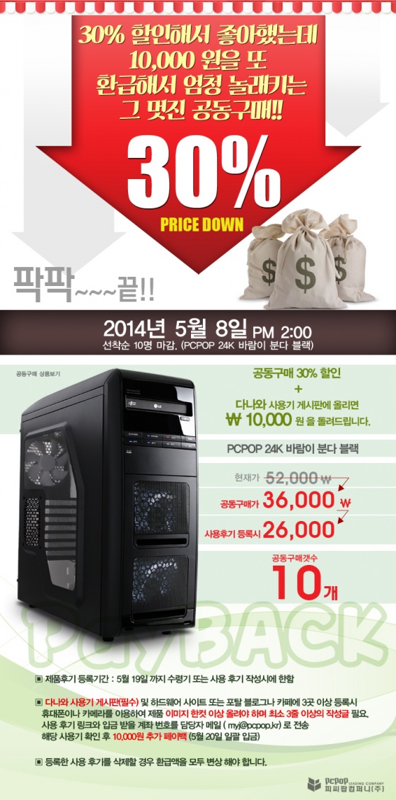 이번에 진행 되는 페이백 공동 구매는 저렴한 가격에 구매가 가능한 것은 물론 구매 후 인증샷과 함께 간단한 글만 적으면 추가 할인을 받을 수 있는 페이백 방식으로 진행된다. 공동 구매 가격은 30% 할인된 36,000원에 진행이 되며, 제품을 수령한 후 휴대폰으로 찍은 사진과 함께 간단하게 글을 적은 인증샷, 또는 제품 사용기를 다나와 사용기 게시판과 각종 컴퓨터 하드웨어 게시판에 간단히 적으면 추가로 1만원을 페이백을 받을 수 있다.