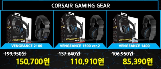 감각적인 블랙 컬러 디자인에 아날로그 방식을 채용한 Vengeance 1400 모델과 USB 방식으로 돌비 가상 7.1채널과 5.1 채널로 웅장한 사운드를 들려주는 Vengeance 1500 ver.2 모델, 무선 / 유선 혼용이 가능한 커세어 헤드셋의 최상위 모델인 Vengeance 2100을 기존 가격보다 더욱 저렴하게 구매할 수 있다.