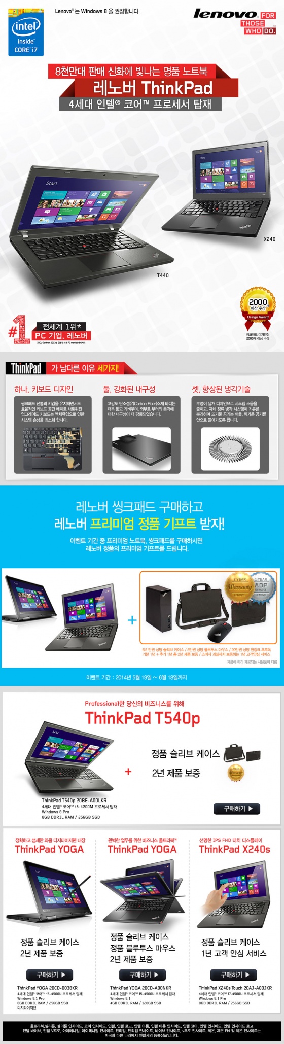 한국레노버는 '씽크패드 X240', 'T440p', 'T440s', '씽크패드 YOGA' 제품을 구입하는 고객들에게 푸짐한 혜택을 제공할 계획이다. 씽크패드 X240을 구매하는 6만5천원 상당의 정품 슬리브 케이스와 2년 제품 보증 서비스를, 씽크패드 T440p를 구매하는 고객에게는 정품 슬리브 케이스와 2년 제품 보증 서비스를, T440s 제품 구매 고객에게는 정품 슬리브 케이스와 2년 제품 보증 서비스를 제공한다. 또한 씽크패드 YOGA 구매 고객에게는 정품 슬리브 케이스 및 블루투스 마우스와 최대 2년 보증 서비스를 제공한다. 행사는 옥션, 신세계몰, H몰에서 진행되며, 사은품은 3개 몰마다 일부 차이가 있다