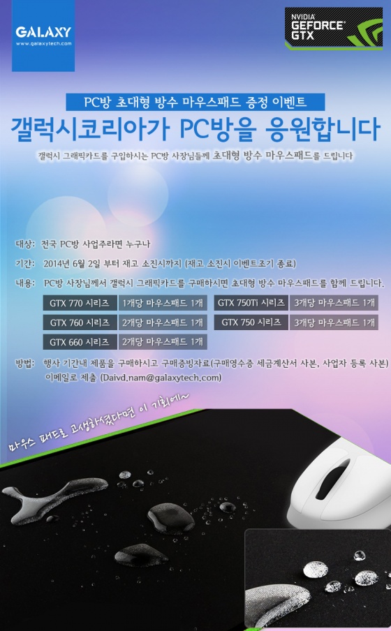 갤럭시 코리아(Galaxy Microsystems Ltd.)가 '갤럭시 지포스' 모델을 구입하는 PC방을 대상으로 '초대형 방수 마우스패드'를 추가 증정하는 이벤트를 실시한다.