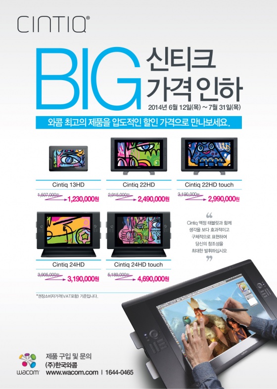 와콤(Wacom)의 한국법인 한국와콤(대표 서석건, www.wacom.com )은 금일부터 오는 7월 31일까지 신티크 전 모델과 신티크 컴패니언 등 크리에이티브 태블릿 제품들의 대대적인 가격인하 이벤트를 진행한다고 밝혔다.