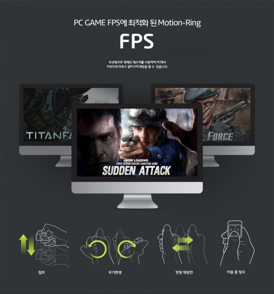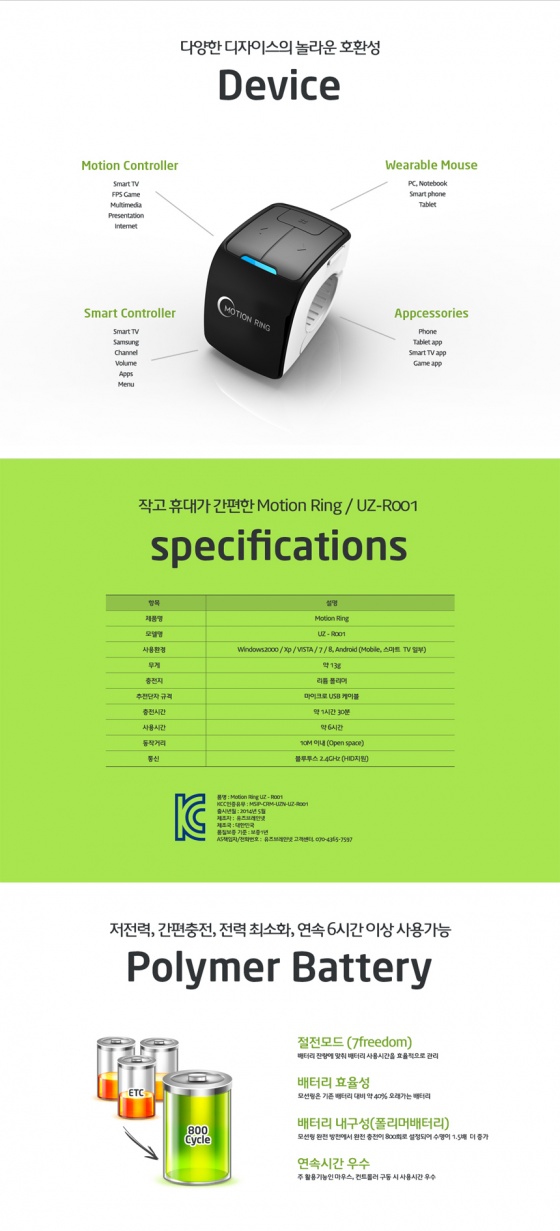 다양하고 편리한 사용자 중심의 스마트기기 제어가 가능한 모션링은 무선통신 모듈 및 위치인식 센서기를 이용한 장치다. 장시간 지원을 위해 저전력 배터리를 장착하여 연속동작 6시간 및 사용 대기시간 20시간을 지원한다. 현재 약 80여가지 제스처 동작 인식을 개발했으며, 개발자 전용 API를 공개하고 개발된 응용프로그램을 공개할 예정이다.