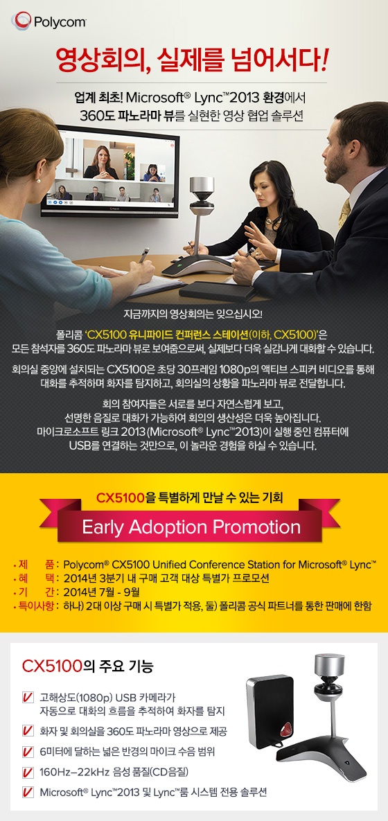 폴리콤코리아 신대준 지사장은 “CX5100 유니파이드 컨퍼런스 스테이션은 업계 최초로 MS 2013 링크와 함께 사용할 때 360도 파노라마 뷰 영상을 제공하는 USB 연결방식의 협업 솔루션이다. 폴리콤은 오랜 기간 동안 MS와 협력을 통해 공동 솔루션 개발은 물론, MS 링크 제품과 호환되는 협업 솔루션 제품라인을 출시해 왔다”라고 말하고, “고객들이 이번 특가 판매 프로모션 기간에 CX5100을 구매하여 폴리콤의 영상 협업 솔루션이 제공하는 뛰어난 기능을 다양한 업무에 활용하여 보다 효과적인 협업과 생산적 회의를 진행할 수 있기를 기대한다”라고 말했다.