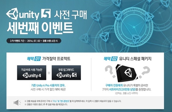 유니티 코리아(대표 양우형)가 '유니티5 Pro 사전 구매' 3차 이벤트를 진행한다.