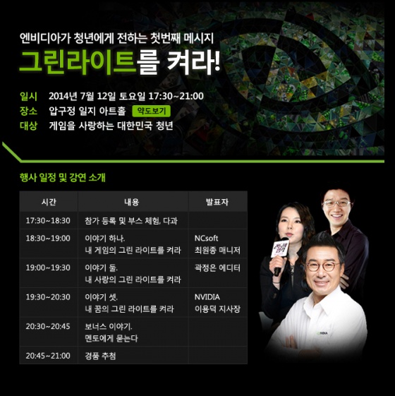 엔비디아 코리아(지사장 이용덕)가 7월 12일(토) 오후 5시 반부터 9시까지 압구정 일지 아트홀에서 청년들의 꿈을 응원하기 위한 '그린라이트를 켜라!'라는 제목으로 멘토링 강연을 개최한다.