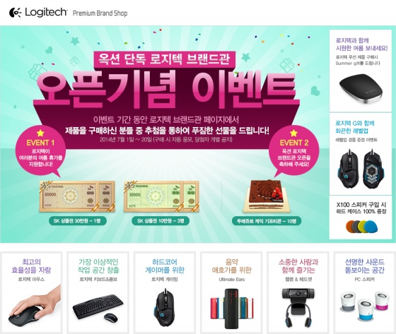 로지텍 브랜드관 페이지는 튜닝 게이밍 마우스 G502 등 게이밍 제품과 UE 붐 등 블루투스 스피커 최신 제품을 비롯해 키보드, 마우스, 웹캠 등 로지텍 대표 제품 80여 종을 선보인다.