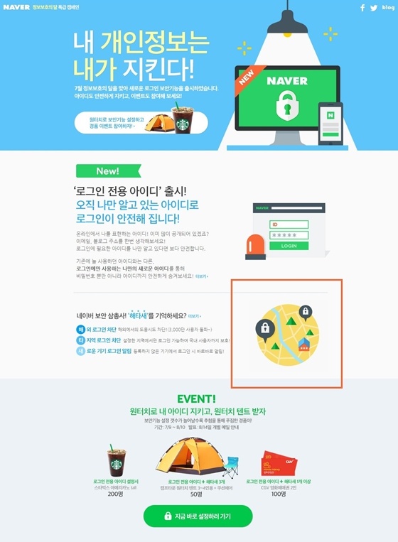 한편 네이버는 7월 정보보호의 달을 맞아 로그인 전용 아이디를 설정한 이용자를 대상으로 추첨을 통해 시원한 여름을 보낼 수 있도록 원터치 텐트, 영화관람권, 커피상품권 등을 제공하는 이벤트도 진행한다.