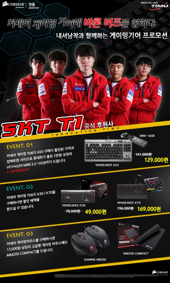 이번 프로모션은 올 시즌 리그 오브 레전드의 프로게임단 SKT T1 공식 후원 브랜드인 커세어 게이밍 기어에 대한 프로모션으로 우선 컴팩트 게이밍 키보드인 K65에 대해 가격 인하 및 사은품 증정이 진행된다.