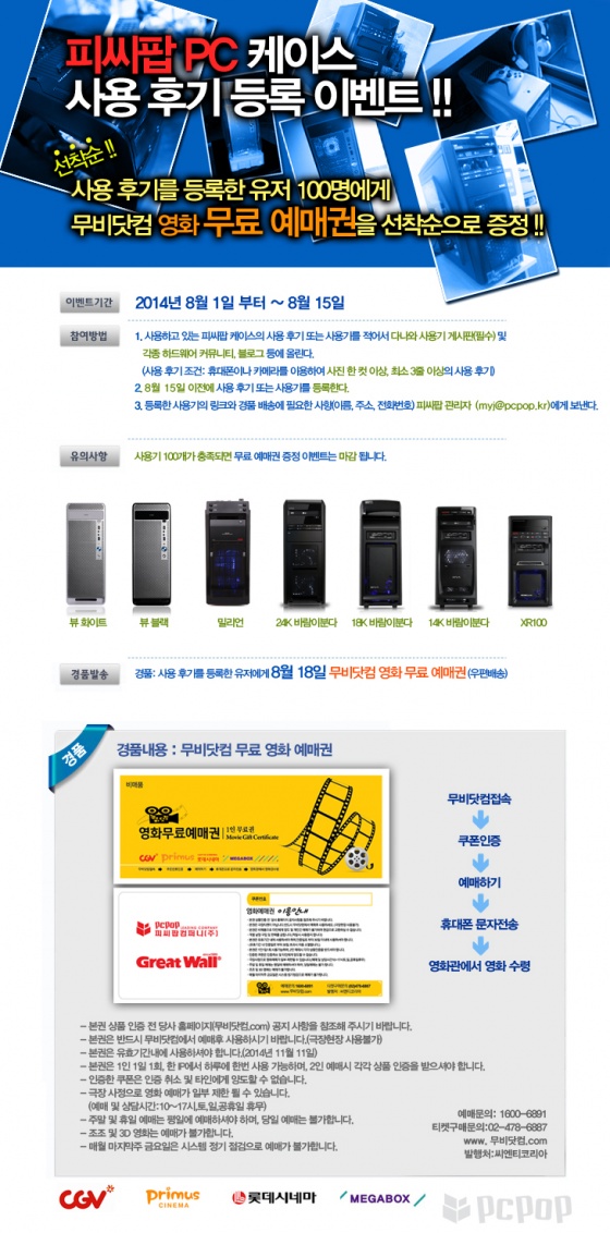 피씨팝컴퍼니(대표:안용모)가 'PC 케이스 사용 후기 등록 이벤트'를 진행하고 선물을 제공한다. 이번 사용 후기 이벤트가 진행되는 모델은 피씨팝의 대표 케이스인 '뷰 케이스'는 물론 '바람이 분다' 시리즈(24K, 18K, 14K), '밀리언(MILLON)', 미니타워 케이스인 'XR100' 제품이며 선착순 100명에게 무비닷컴 영화 무료 예매권을 제공할 예정이다.