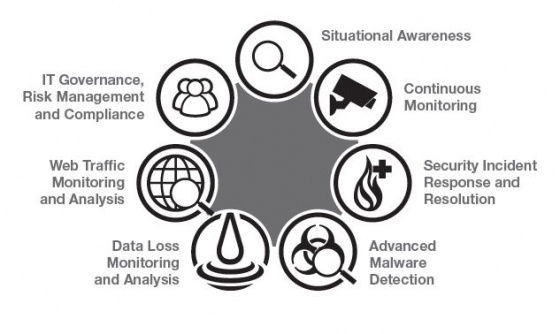 블루코트는 IT인프라의 보안 상황을 확인하는 시점 및 관리 방법을 기준으로 상황 인식 지속적인 모니터링 보안 사고 대응 및 해결 지능형 멀웨어 탐지, 데이터 유실 모니터링 및 분석, 웹 트래픽 모니터링 및 분석, IT 거버전스, 리스크 관리 및 컴플라이언스 준수 등의 7단계로 분류해 분석했다.