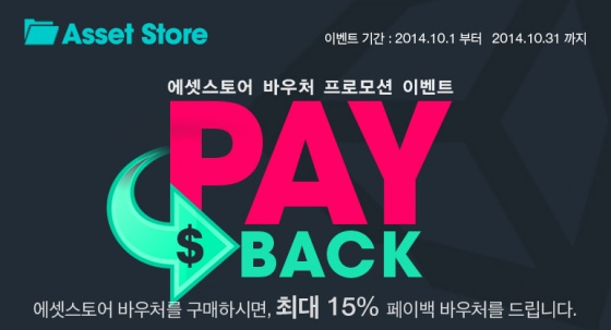 유니티 엔진 개발 관련 툴과 콘텐츠 등의 리소스를 구매 및 판매 가능한 오픈 마켓인 에셋 스토어는 10월 중으로 $500, $1000, $1500 바우쳐를 구매한 개발사를 대상으로 각각 5%, 10%, 15%의 바우처를 추가로 증정하는 'Pay Back' 이벤트를 진행한다.