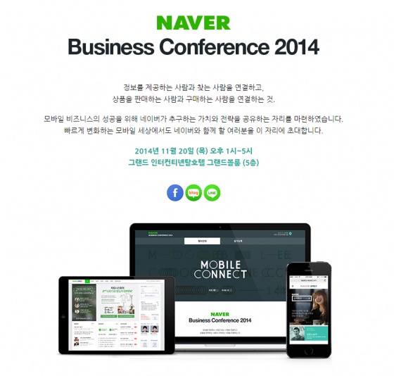 '네이버 비즈니스 컨퍼런스 2014'는 사업가나 마케팅 업계 관계자, 모바일 마케팅에 관심이 있는 사용자들에게 모바일 비즈니스 전략과 방향성을 제안하는 행사로, 11월 20일 오후 1시부터 5시까지 서울 삼성동 그랜드 인터컨티넨탈 그랜드볼룸(5층)에서 진행된다.