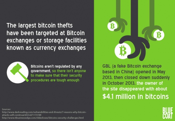 실제로 이와 관련된 비트코인 사기 및 폰지 사기(ponzi scheme: 신규 투자자의 돈으로 기존 투자자에게 이자나 배당금을 지급하는 방식의 다단계 금융사기) 사건이 여러 차례 보도 된 바 있으며 지금 이 순간에도 많은 사건들이 발생하고 있다. 실제로 지난 해 중국에 기반을 두고 5월에 설립된 중국 비트코인 거래 사이트인 'GBL'이 10월에 접속을 끊어 1000여 고객 계정에 410만달러(약 44억원) 가치의 비트코인을 가져갔다.