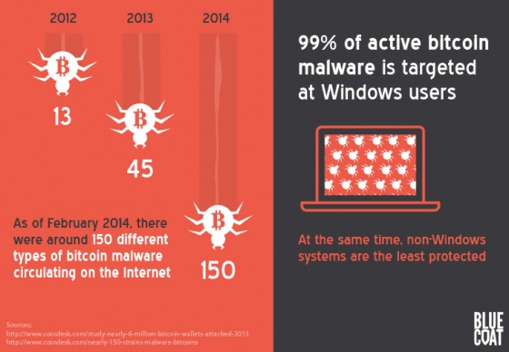 실제로 블루코트가 전세계에 구축된 자사의 네트워크 트래픽 측정 시스템의 데이터 분석 결과, 지난 2012년에 13개, 2013년에 45개였던 비트코인 해킹 멀웨어가 2014년 2월에는 150개로 크게 증가되어 인터넷에 유포되었으며, 이러한 멀웨어의 99%는 윈도우(Windows) OS기반 기기 사용자를 타깃으로 하고 있는 것으로 조사되었다.