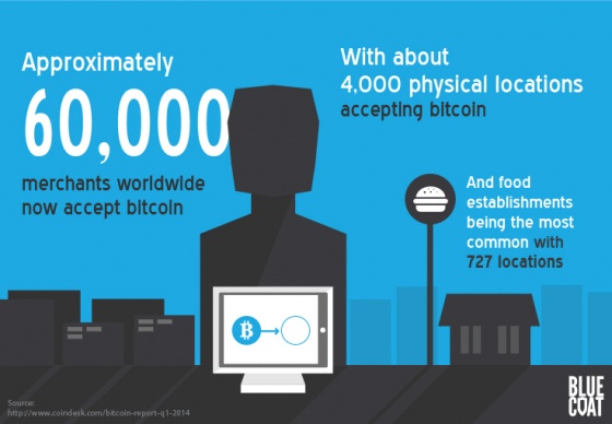 비트코인이 탄생한지 불과 6년의 시간이 지났다는 점을 감안한다면, 현재의 입지는 일약 부상한 수준이라고 해도 과언이 아니다. 실제로 블루코트의 조사에 따르면, 현재 전세계 6만여 개의 기업은 물론 일반 오프라인 매장 4000여곳에서 비트코인을 결제 수단으로 인정하여 사용되고 있으며, 이 중에는 소셜게임업체인 징가(Zynga) 및 온라인 종합쇼핑몰 오버스톡(Overstock), 이베이(eBay) 등도 포함되어 있다.