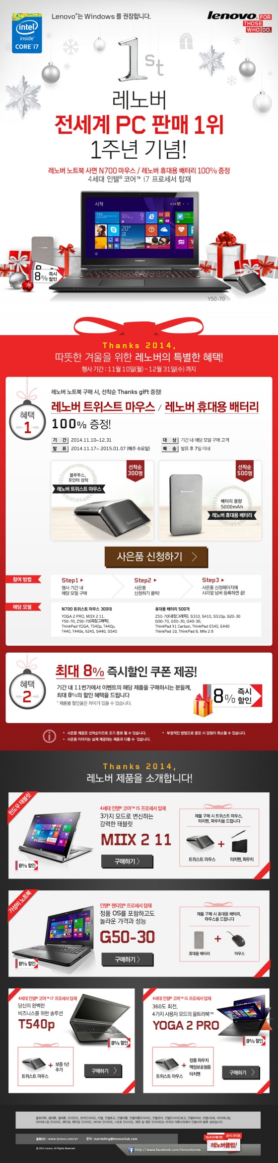 세계 1위 1주년 연말 이벤트 및 해당 제품에 대한 자세한 내용은 G 마켓, 11번가, 옥션의 홈페이지 및 레노버클럽에서 확인할 수 있다.