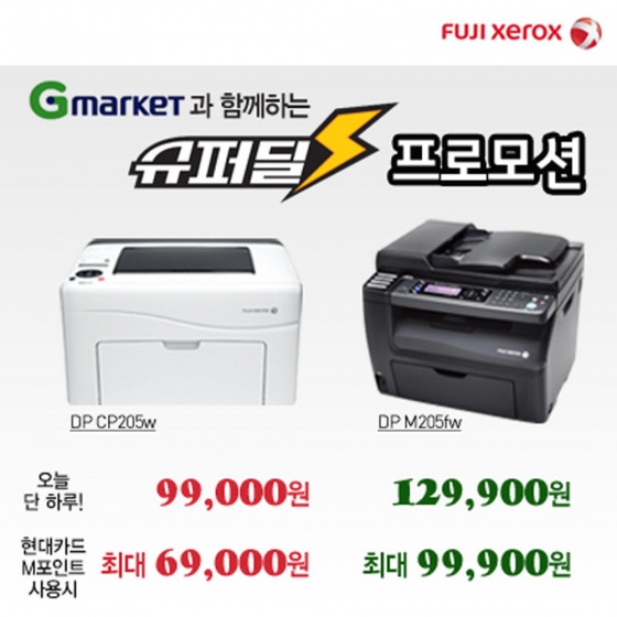 G마켓 슈퍼딜 코너는 1일 한정 IT기기, 의류, 잡화 등 G마켓이 선정한 각 카테고리 별 Hot item을 특가에 판매하는 이벤트이다. 소비자들은 8일 자정부터 G마켓에서 후지제록스 프린터스의 'CP 205w'를 21% 할인된 가격인 99,000원, 'M205fw'를 23%할인된 129,900원에 구매할 수 있다. 특히 현대카드 사용자들은 M포인트를 최대 30,000원 사용했을 경우, 두 제품을 각각 69,000원 및 99,900원에 구매 가능하다.